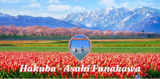 Mùa xuân đã đến dọc theo sông Asahi Funakawa, Hoa anh đào đang nở rộ và bạn có thể thưởng thức “Bộ tứ mùa xuân” trên nền núi và tuyết. Niềm vui ngắm hoa anh đào được nhân đôi với hoa cải và hoa tulip.