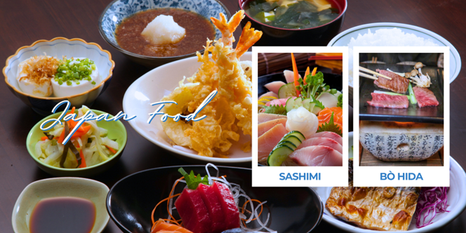 • Mức ăn cao ăn trưa và tối trị giá 2500/3000 Yên/ khách/ bữa, Bò Hida Sashimi và Sashimi